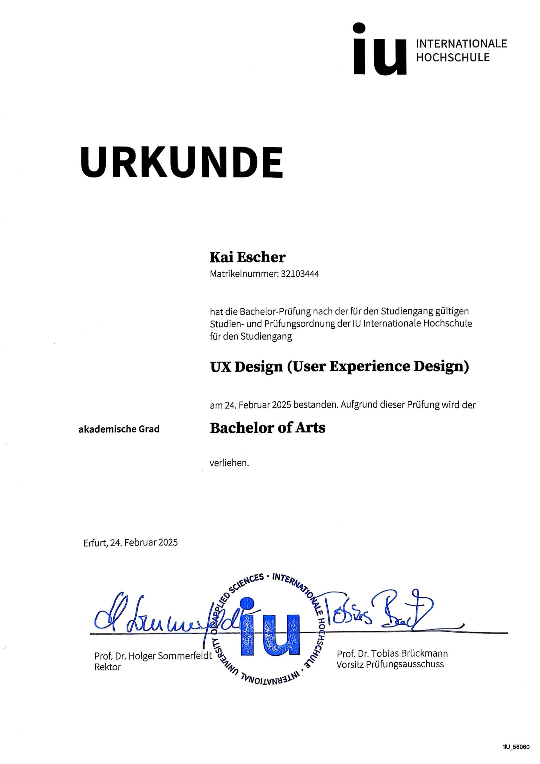 2025 habe ich meinen Bachelor in User Experience Design (UX-Design) an der IU Internationalen Hochschule abgeschlossen. Nun starte ich mit voller Motivation, Neugier und Begeisterung in die Welt des nutzerzentrierten Designprozesses.
